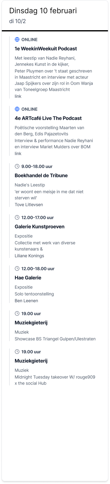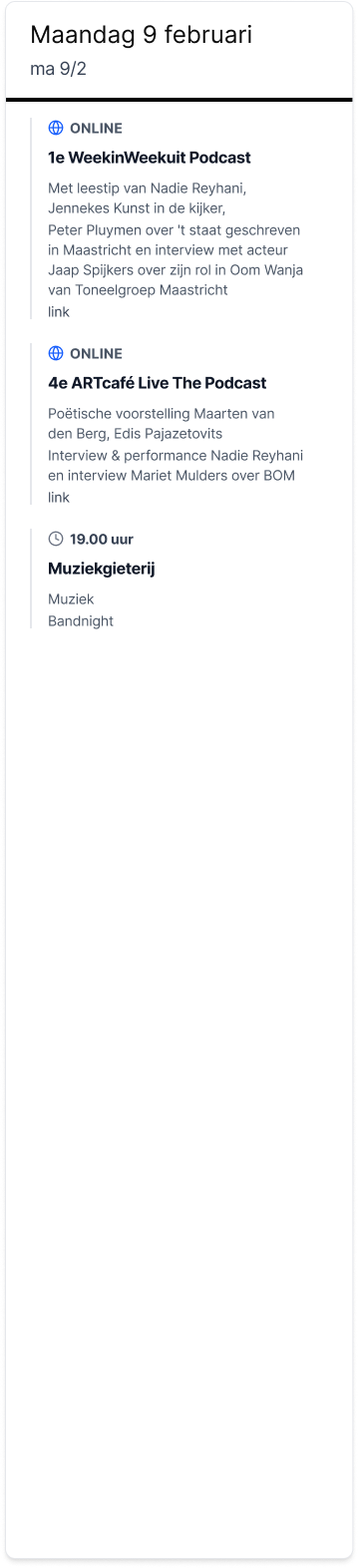 ARTcafé WeekinWeekuit; een tweewekelijks cultureel agenda overzicht met Nadie’s Leestip, Jenneke’s kunst in de kijker, Patricks Pop & Rock, Juliette’s special program en Peters’ ’t staat geschreven in Maastricht.