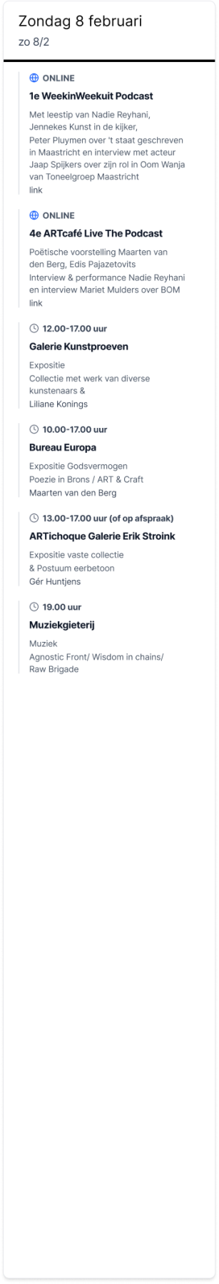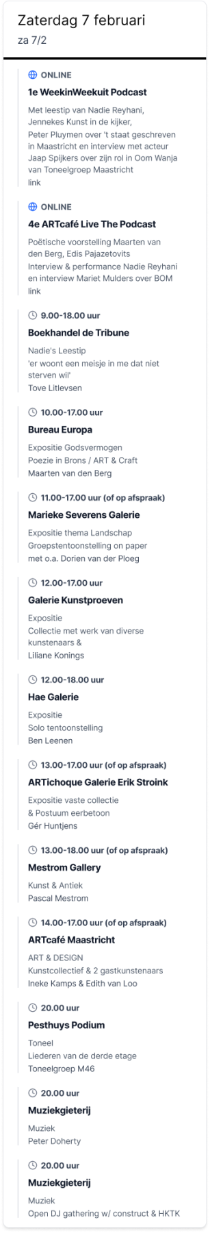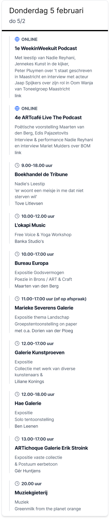 Dit ARTcafé WeekinWeekuit programma overzicht wordt mede mogelijk gemaakt door BOEKHANDEL DE TRIBUNE, DE MUZIEKGIETERIJ, ARTMAP & MAASTRICHTGALLERYWEEKEND, ARTCAFEMAASTRICHT en HYPOTHEEK VISIE MAASTRICHT en met een subsidiebijdrage Taol & Cultuur van de GEMEENTE MAASTRICHT.